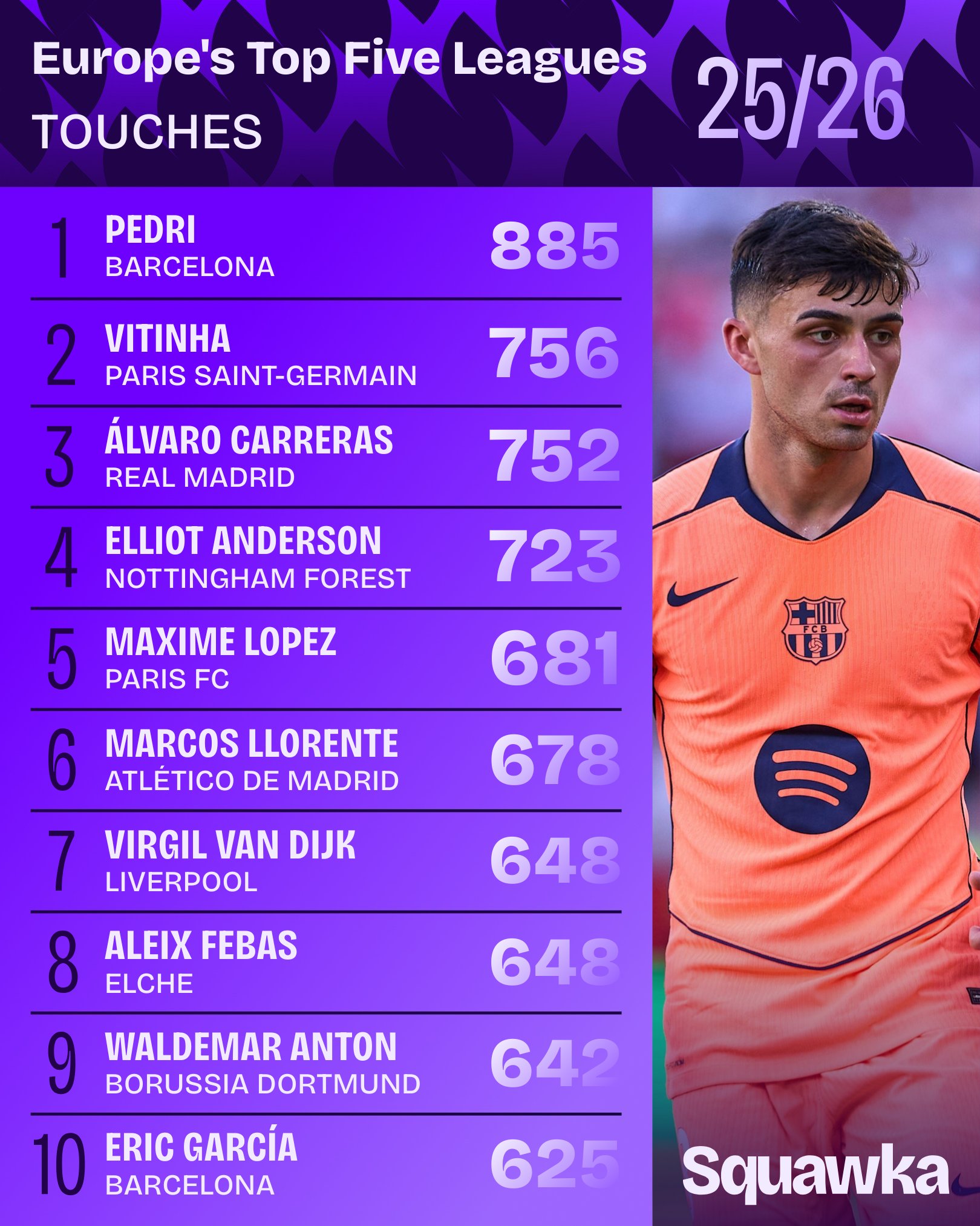 來(lái)源:X虎撲10月16日訊 Squawka數據統計本賽季至今五大聯(lián)賽觸球榜,佩德里885次居首。至今