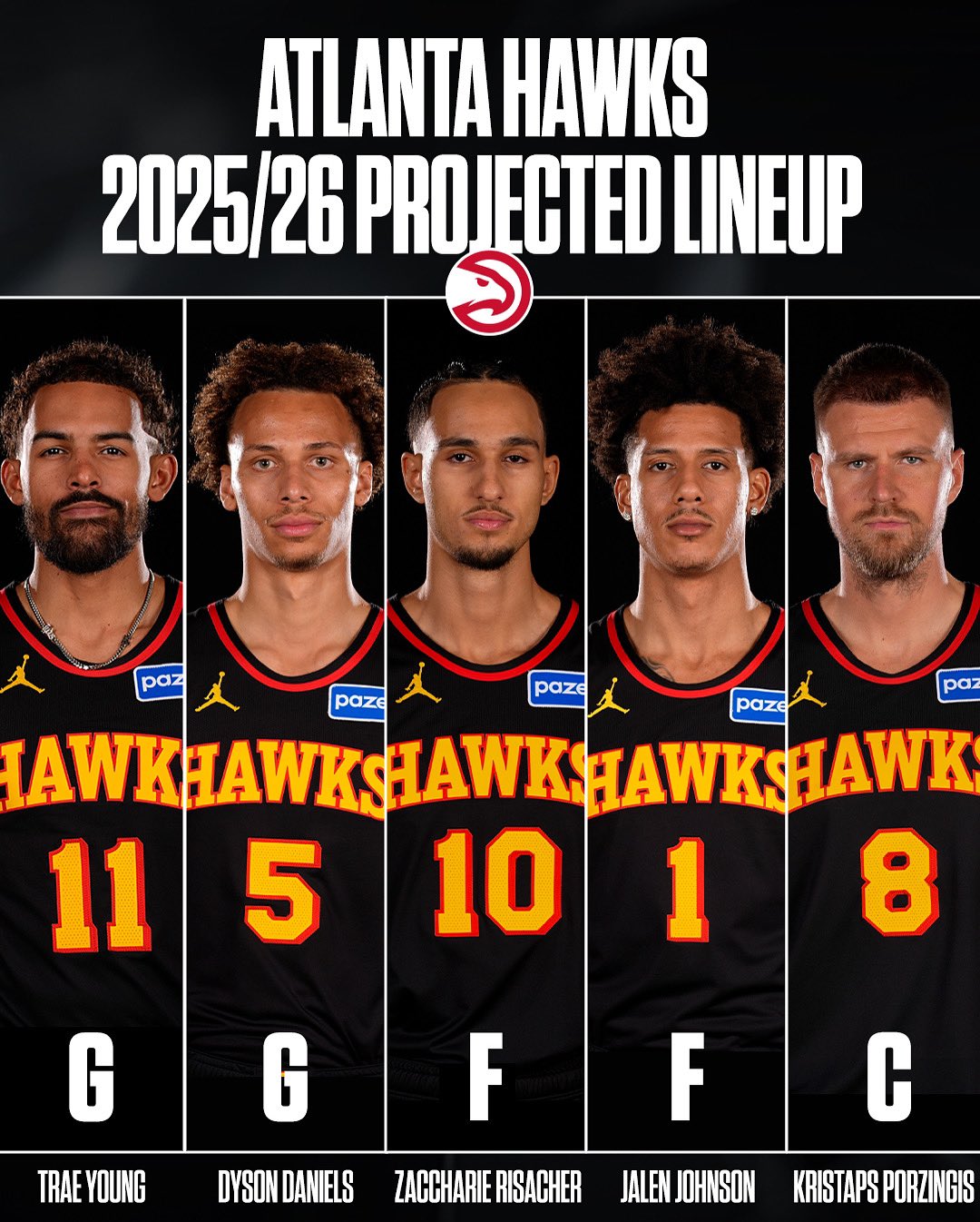 圖中的新賽五名球員是:特雷-楊,戴森-丹尼爾斯,贏(yíng)多扎卡里-里薩謝,少場(chǎng)杰倫-約翰遜和克里斯塔普斯-波爾津吉斯。流言老鷹