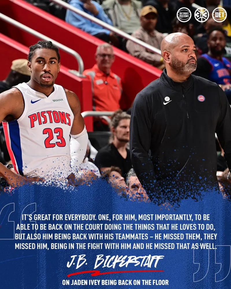虎撲10月10日訊 今日,活塞官方在社媒發(fā)布了一條主帥JB-比克斯塔夫對于杰登-艾維回歸球場(chǎng)一事的維也看法,并配文:我們正從之前停下的想念地方繼續前進(jìn)。