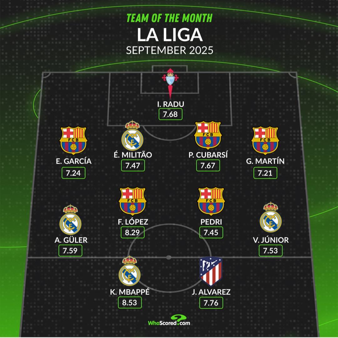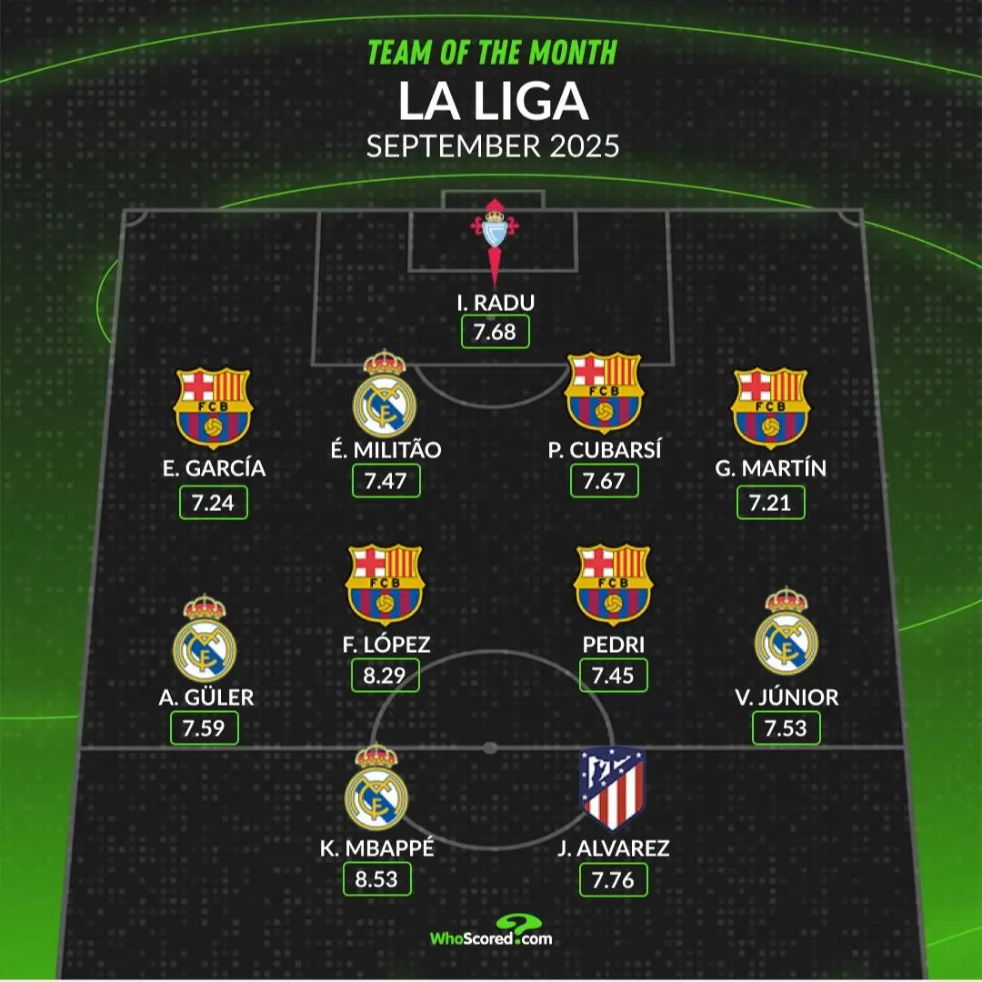 來(lái)源:X虎撲10月01日訊 Whoscored評選西甲聯(lián)賽9月最佳陣容,姆巴佩、佩德里、阿爾瓦雷斯領(lǐng)銜,巴薩5人入選,皇馬4人。