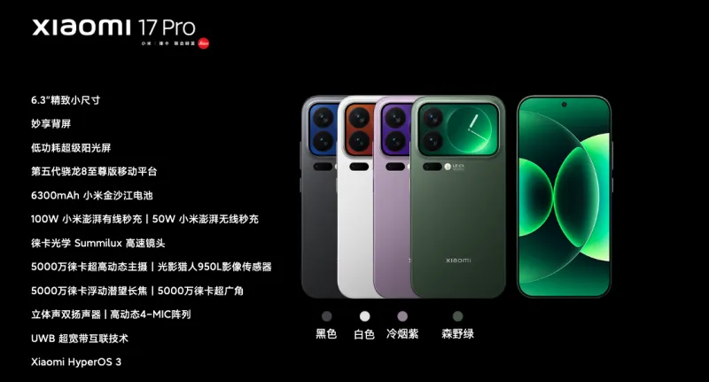 小米17ProMax整機厚度 8.0mm,重量 219g,搭載 6.9 英寸 OLED 屏幕,支持 1–120Hz 自適應刷新率、1.5K 分辨率,采用華星 M10 發(fā)光材料與RealRGB排布,同時(shí)支持全亮度 DC 調光與圓偏振光設計,減少反光與頻閃;搭載驍龍 8 Elite Gen 5 處理器,配備 LPDDR5X 內存 與 UFS 4.1 閃存,新一代旗艦芯片帶來(lái)更強的圖形與AI計算能力;內置 7500mAh 超大電池,支持 100W 有線(xiàn)快充 + 50W 無(wú)線(xiàn)快充;后置影像系統由四顆 5000 萬(wàn)像素鏡頭組成,主攝為 5000 萬(wàn)像素 1/1.28'' 大底傳感器(SC509CS);超廣角為 5000 萬(wàn)像素 OV50M 傳感器;長(cháng)焦采用 5000 萬(wàn)像素潛望式長(cháng)焦(三星 JN5 傳感器,支持 5X 光變),同時(shí)配備 5000 萬(wàn)像素前置鏡頭。支持 IP68 級防塵防水,并具備妙享背屏 + UWB 超寬帶功能,配合 3D 超聲波指紋識別和立體環(huán)形冷泵散熱系統。出廠(chǎng)預裝 Xiaomi HyperOS 3,在系統流暢性、跨設備互聯(lián)與 AI 智能體驗上全面升級。支持 Wi-Fi 7 與 USB 3.2 接口。