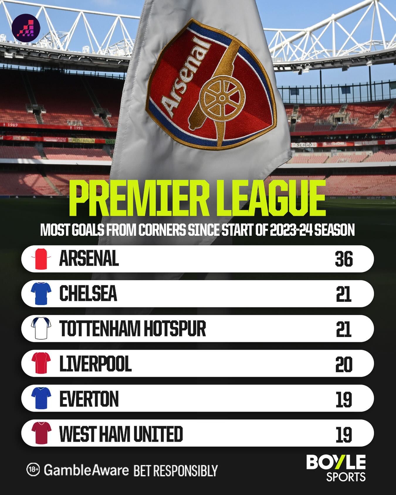 Opta數據統計,英超遙領(lǐng)自2023/24賽季以來(lái)英超球隊角球破門(mén)榜,球隊球遙阿森納36球遙遙領(lǐng)先,角球切爾西、破門(mén)熱刺21球并列第二。板自榜