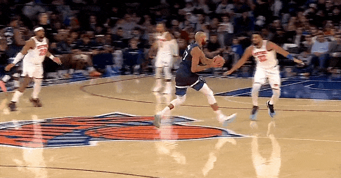 第三節比賽中,過(guò)半過(guò)人戈貝爾運球過(guò)半場(chǎng)試圖歐洲步過(guò)人,場(chǎng)試被唐斯搶斷打反擊。圖歐