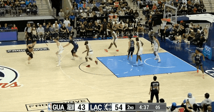 第二節比賽,管煜管子煜錯位單打祖巴茨,錯位茨加加速突破急停干拔跳投命中。單打