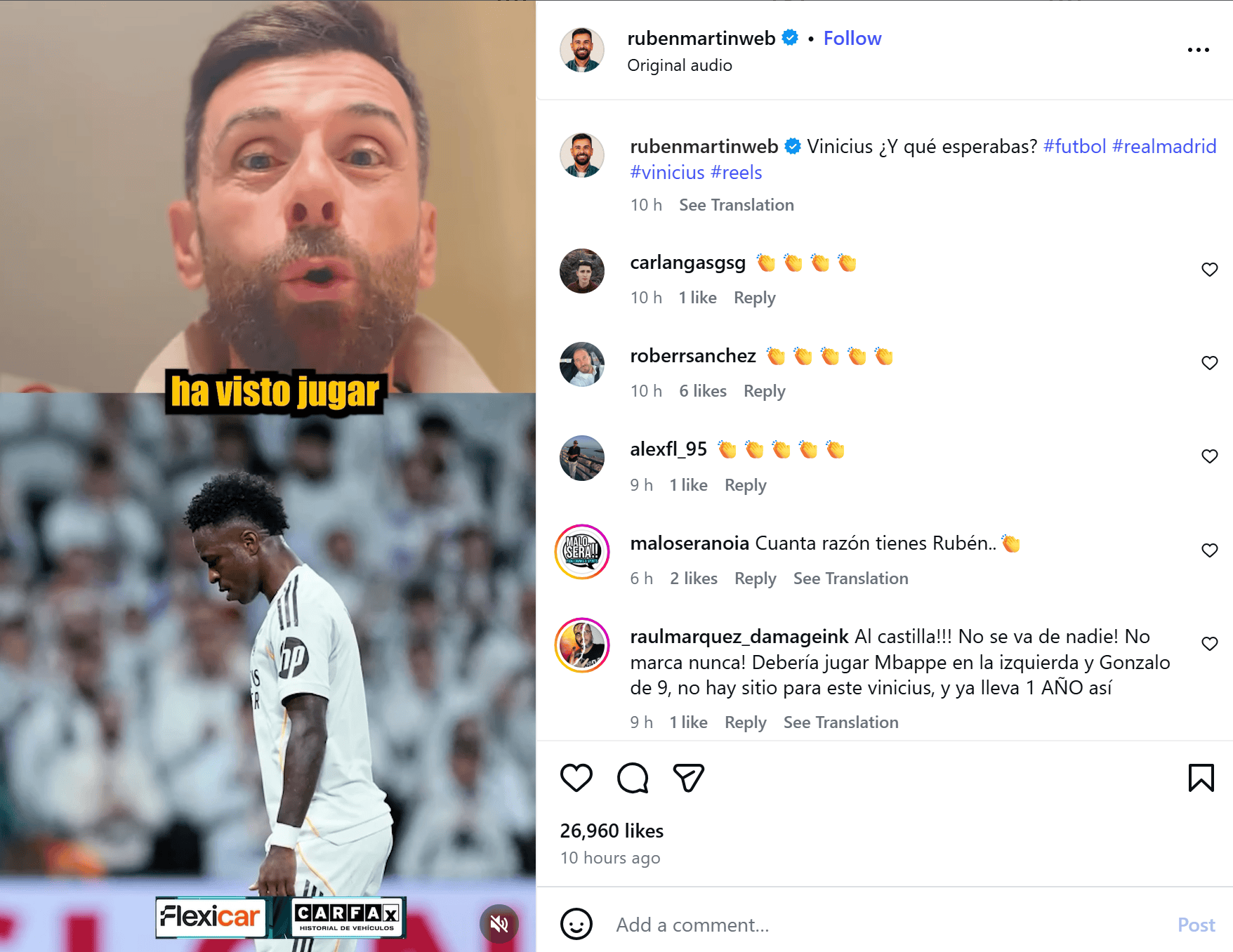 對此,科帕電臺記者魯本-馬丁在其Instagram平臺發(fā)布視頻,對維尼修斯近期的行為進(jìn)行了直接點(diǎn)評。