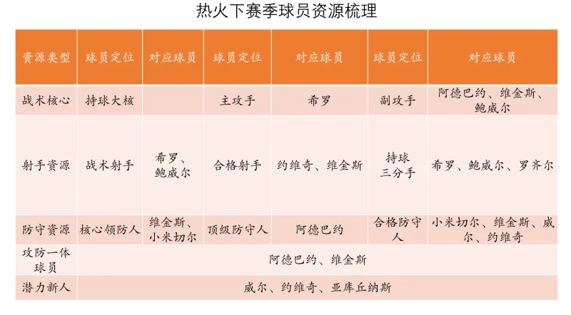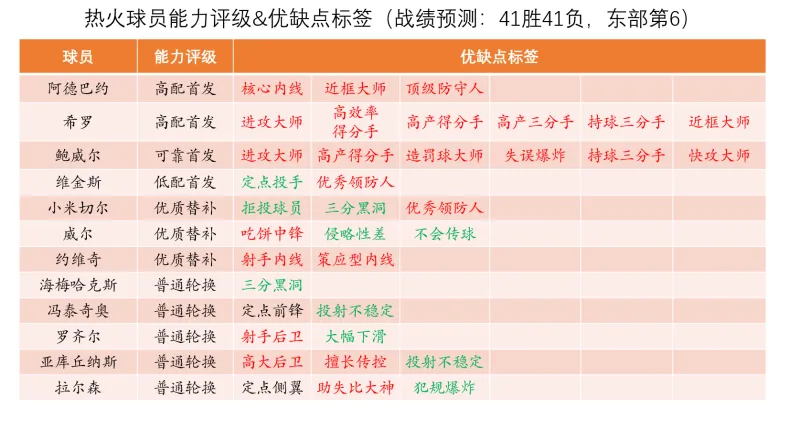 最后是熱火球員的能力評級和一些優(yōu)缺點(diǎn)總結,可以看到球隊有4名首發(fā)級別球員和3名優(yōu)質(zhì)替補,整體的陣容深度還是不錯的。模型也給與了球隊下賽季41勝41負、東部第6的戰績(jì)預測,當然該預測的前提是希羅和鮑威爾25賽季的進(jìn)步能保持住,如果他們的投射出現較大滑坡,對熱火整體進(jìn)攻的影響會(huì )很大。