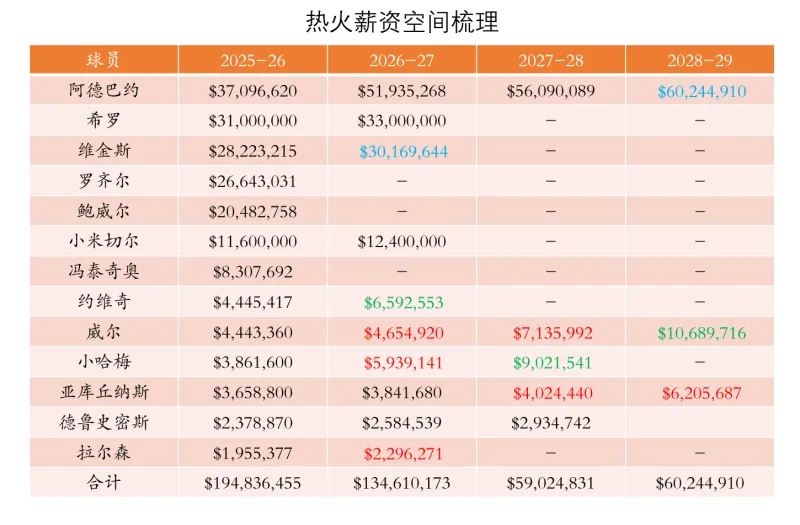 不過(guò)27賽季的合同中包括了威爾、小哈梅和拉爾森的球隊選項(紅色)和約維奇的資質(zhì)報價(jià)占位(綠色),如果把這些錢(qián)去掉熱火還能增加2000萬(wàn)的空間,最后如果能說(shuō)服嘴哥跳出合同簽一份起薪降低的長(cháng)約,湊出一份頂薪合同是可能的,但肉眼可見(jiàn)地操作難度較大。