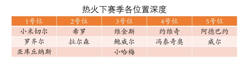 上表展示了目前熱火各位置的深度情況,可以看到1號位上并沒(méi)有一個(gè)出色的持球人,這使得球隊的進(jìn)攻開(kāi)發(fā)更多依賴(lài)團隊協(xié)作和大量的無(wú)球跑動(dòng),但這一招在遇到防守紀律強的球隊時(shí)很容易吃癟,因此熱火面對防守前6級別球隊時(shí)的戰績(jì)非常糟糕。此外在不考慮馮泰奇奧的前提下,熱火4、5號位上只有3名合格水準球員、深度較為單薄,也會(huì )是常規賽的一大隱患。
