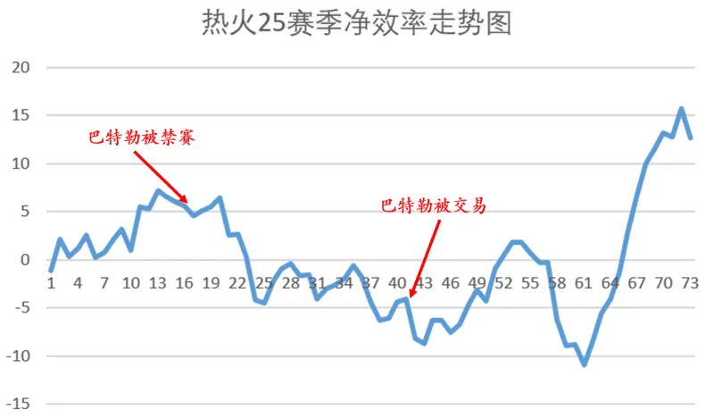 巴特勒離隊對熱火的影響從上面的25賽季凈效率走勢圖也能清晰看到,在巴特勒被禁賽之前,球隊打出了14勝11負的戰績(jì),百回合凈勝分為2.62分且始終保持在0以上。但自巴特勒被禁賽后,球隊的凈效率值開(kāi)始震蕩下滑,期間球隊戰績(jì)只有12勝12負、百回合凈勝分降到了-2.49分,從一只季后賽末端球隊變成了一支附加賽級別球隊。而在巴特勒被交易后,補充了新援的熱火也依然沒(méi)有緩過(guò)來(lái),2月開(kāi)始的戰績(jì)只有12勝21負、還一度經(jīng)歷了10連敗。不過(guò)從上圖來(lái)看,在賽季最后10場(chǎng)比賽中熱火打出了很高的凈效率,不過(guò)大勝的球隊成色較差,包括黃蜂、無(wú)庫勇士、76人、奇才、鵜鶘、輪休綠軍等擺爛或戰力受損的球隊,新賽季如何解決“巴特勒離隊后的戰力提升問(wèn)題”是關(guān)鍵。