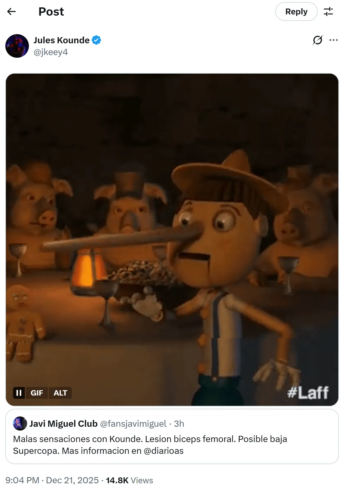 針對這一說(shuō)法,孔德轉發(fā)了Javi Miguel的相關(guān)推文,并配上了一張動(dòng)畫(huà)GIF進(jìn)行回應。該GIF畫(huà)面中,匹諾曹因說(shuō)謊而鼻子不斷變長(cháng),帶有明顯的諷刺意味。這一舉動(dòng)被外界解讀為,孔德對上述傷缺時(shí)間說(shuō)法的一種態(tài)度表達。