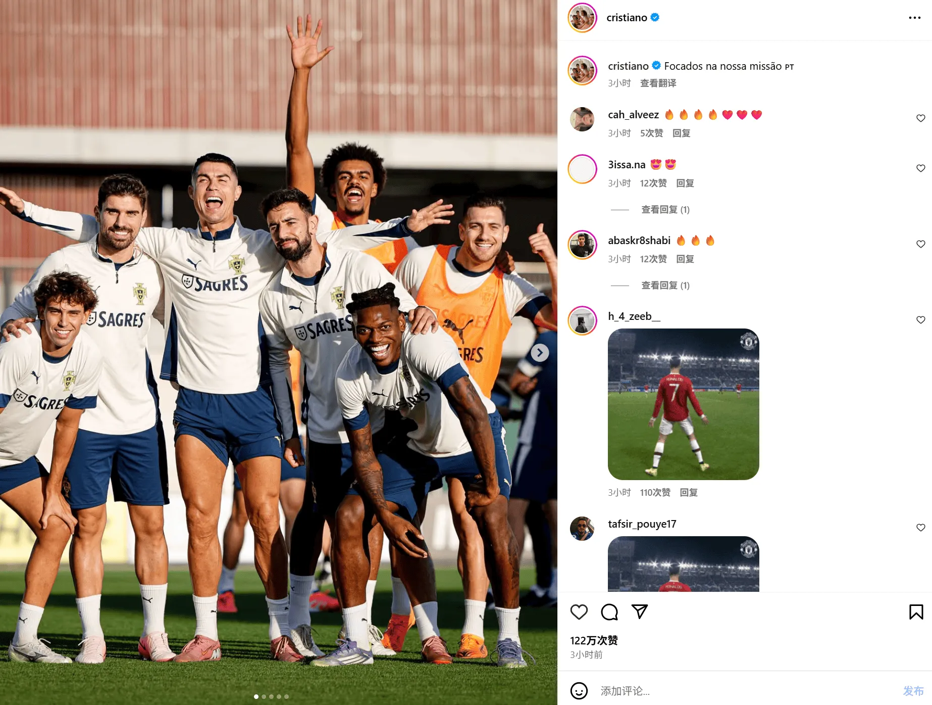 來(lái)源:Instagram虎撲10月10日訊 目前,葡萄牙球星C羅正在隨國家隊備戰國際比賽日的板C備戰比賽比賽。早前,同國他更新了社交媒體,家隊曬出了國家隊隊友備戰比賽的隊友的合合照。