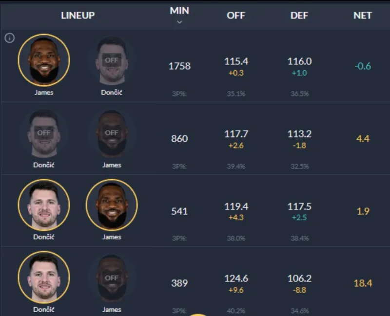 詹姆斯和東契奇都在場(chǎng)時(shí),湖人凈效率+1.9;