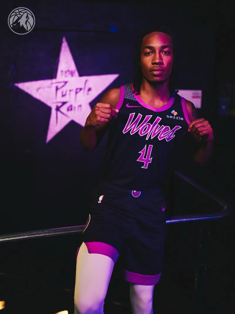 此球衣延續了球隊2018-2019賽季城市版球衣的樣式,致敬了明尼蘇達州傳奇音樂(lè )偶像、已故的7屆格萊美獎得主Prince王子(普林斯-羅杰斯-內爾森)。