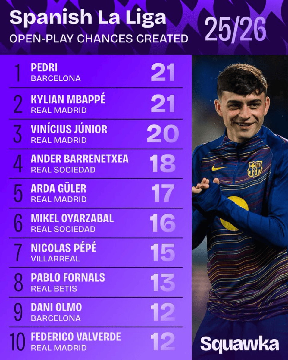 [流言板]佩德里和姆巴佩是本賽季西甲運動(dòng)戰創(chuàng )造機會(huì )最多的球員