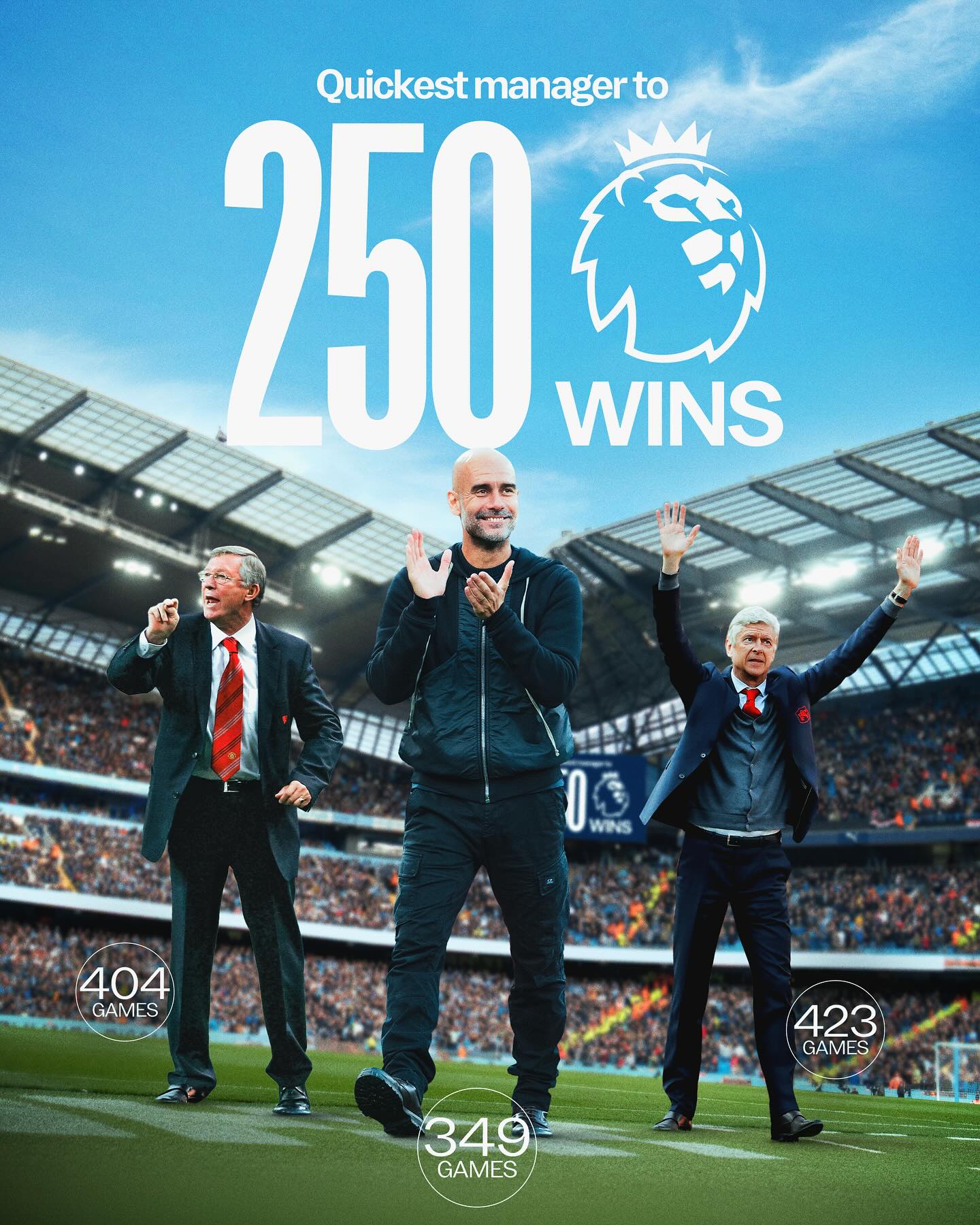 瓜迪奧拉僅用349場(chǎng)英超比賽就達成250場(chǎng)勝利,場(chǎng)勝城官曼城官方發(fā)布海報紀念這一里程碑時(shí)刻。流言拉場(chǎng)利