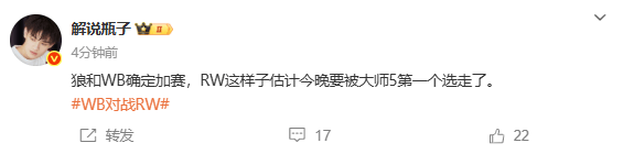 發(fā)文來(lái)源:微博 發(fā)文虎撲10月11日訊 瓶子發(fā)文:狼和WB確定加賽,RW估計今晚要被大師5第一個(gè)選走,發(fā)文原文如下: