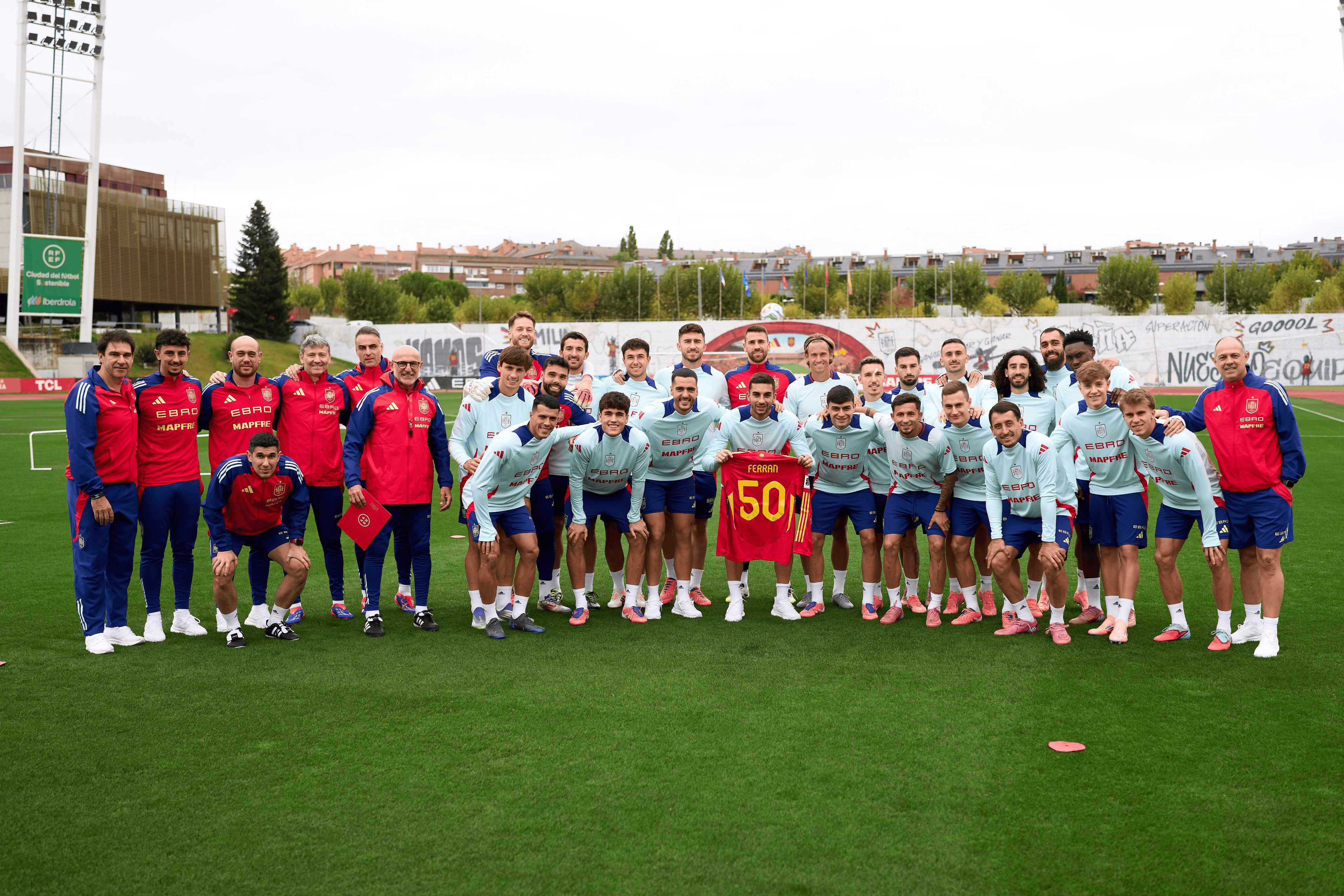 今天的全隊訓練開(kāi)始前,西班牙全隊和費蘭一起慶祝這一里程碑。同慶