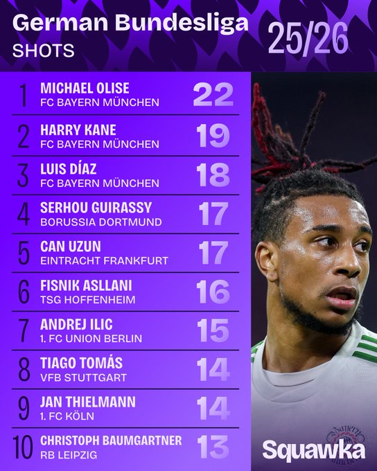 來(lái)源:X虎撲09月29日訊 Squawka數據統計德甲本賽季至今射門(mén)次數榜,奧利塞、流言利塞攬前凱恩、板德榜奧迪亞斯包攬前三名。甲本