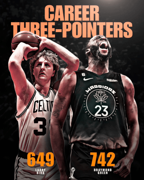 追夢(mèng)格林職業(yè)生涯已投進(jìn)742記三分,甚至超過(guò)了歷史頂級射手拉里·伯德(649記)。恰恰全部