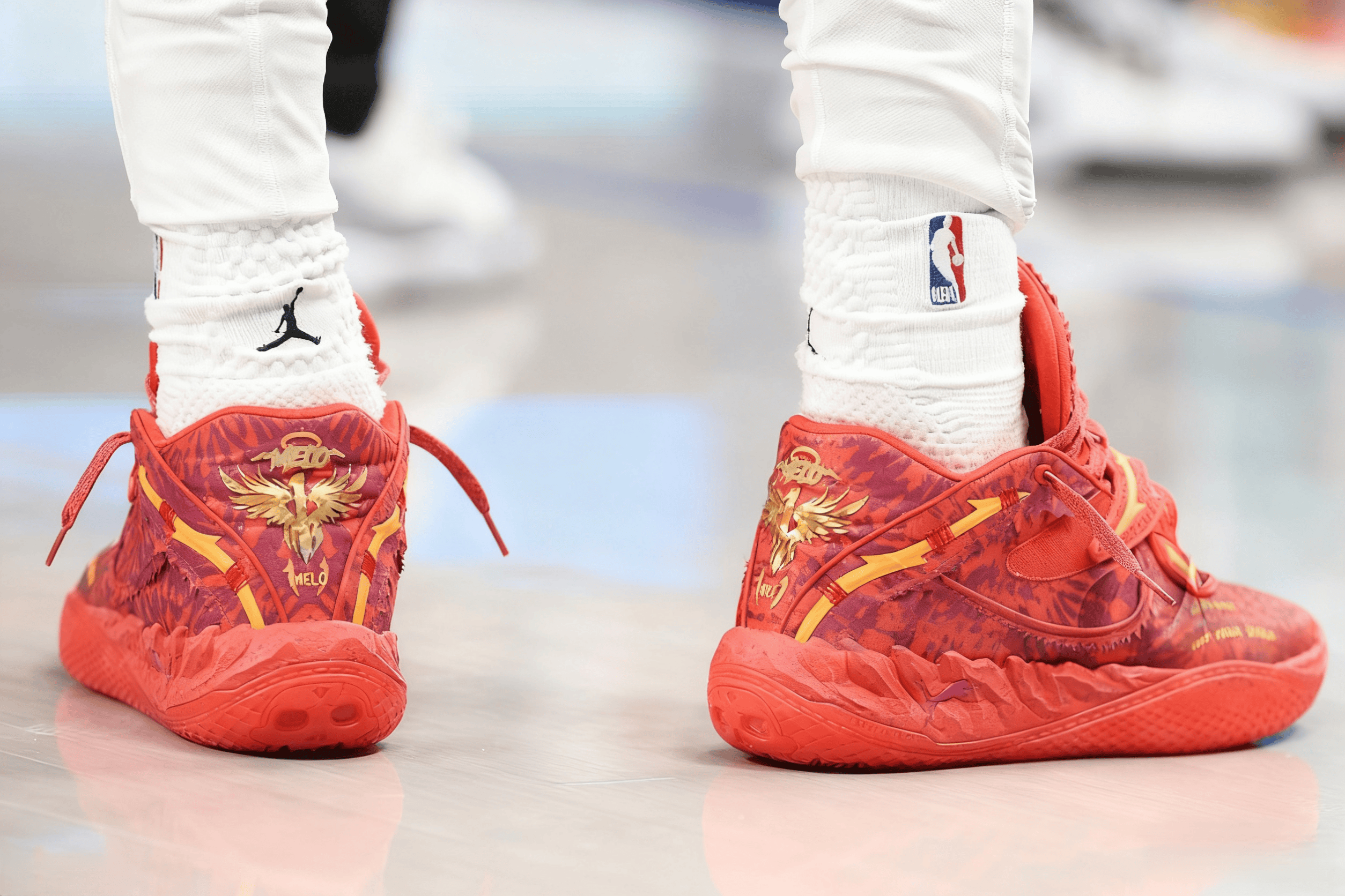 比賽中,鮑爾上腳火焰紅色Puma MB.05“Encore”。