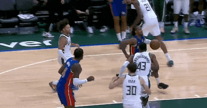 第四節比賽中,哥送鼓掌字母哥哥薩納西斯送出大帽又完成搶斷,完成上場(chǎng)6分鐘得到4分2籃板1搶斷1蓋帽,搶斷慶祝字母哥揚尼斯不停鼓掌慶祝。字母