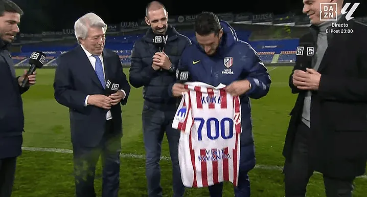 虎撲11月23日訊 西甲第13輪,馬德里競技客場(chǎng)1-0赫塔菲。在慶??瓶嗽隈R德里競技完成700場(chǎng)比賽之際,隊友們送給了他一件由全隊簽名的球衣??瓶艘步邮芰嗣襟w采訪(fǎng)。
