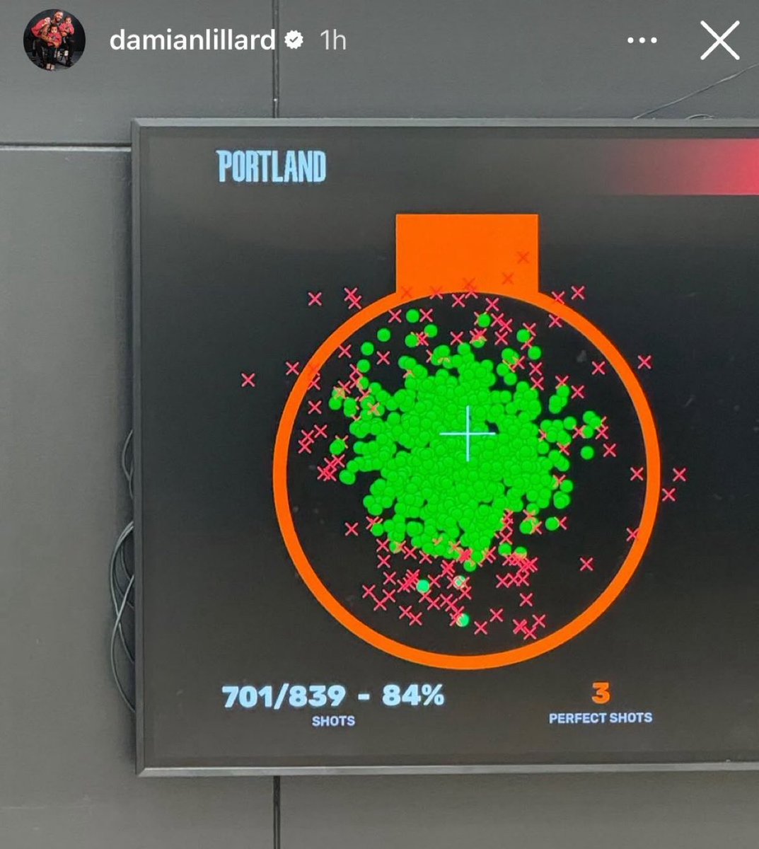虎撲12月21日訊 近日,開(kāi)拓者球員達米安-利拉德更新了自己的曬投勢INS快拍,曬出了自己在投籃訓練中的命中率(701/839,84%)。