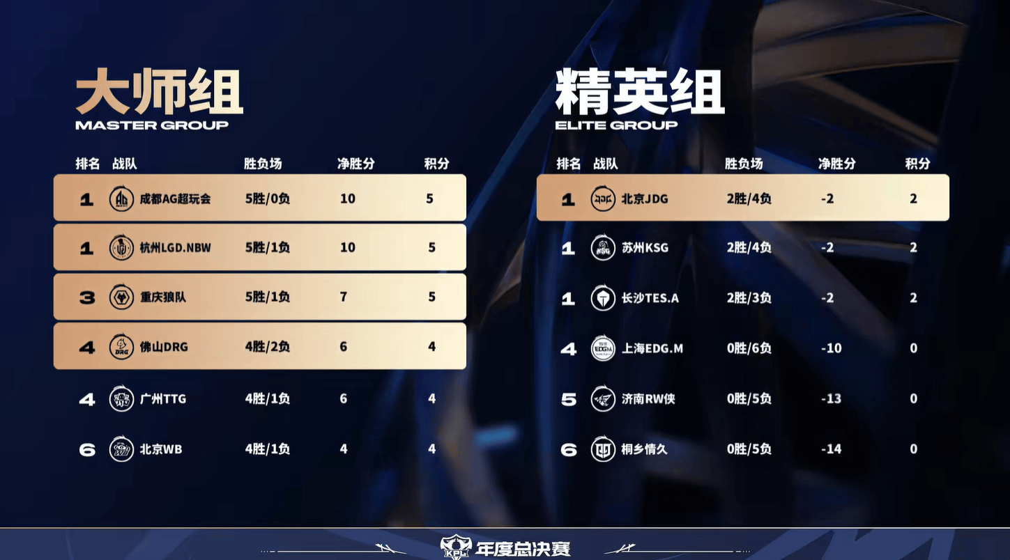 北京JDG 蘇州KSG 均2勝4負,長(cháng)沙滔搏 2勝3負,三支隊伍均凈勝分-2分,積2分,并列精英組榜首;