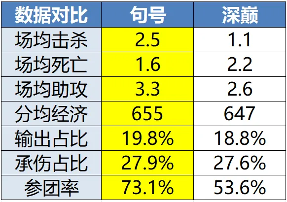 而深巔這邊,只能說(shuō)數據并不能完全反映他的表現。但看數據的話(huà),深巔倒數第三的KDA和場(chǎng)均擊殺,倒數第一的參團率、正數第二的場(chǎng)均死亡,完全該去和情久安七、RW俠無(wú)雙坐一個(gè)桌??稍陂L(cháng)沙TES.A攻擂成功的比賽里,深巔的MVP占了隊伍的一半。