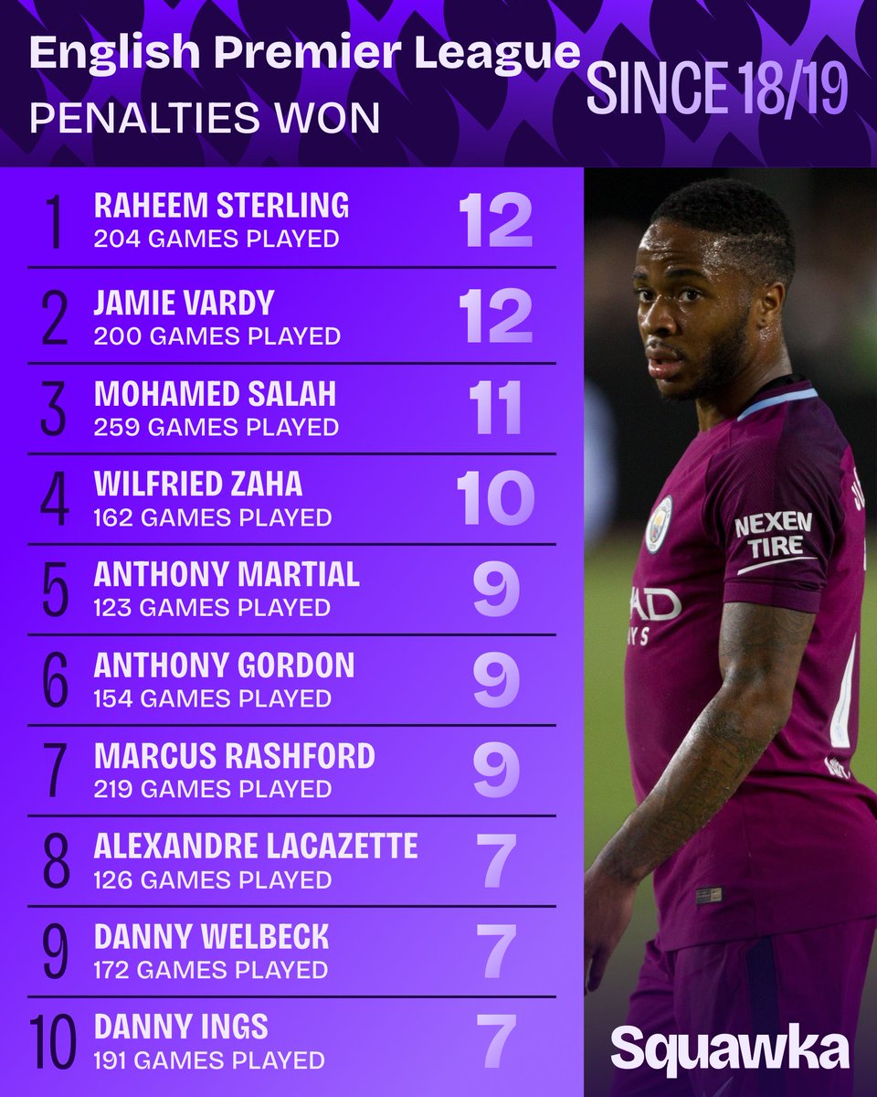 來(lái)源:X虎撲10月12日訊 Squawka數據統計,2018/19賽季以來(lái)英超聯(lián)賽贏(yíng)得點(diǎn)球次數最多榜單。季英斯特林、超造瓦爾迪12次并列第一,點(diǎn)榜第薩第薩拉赫11次第三。斯特