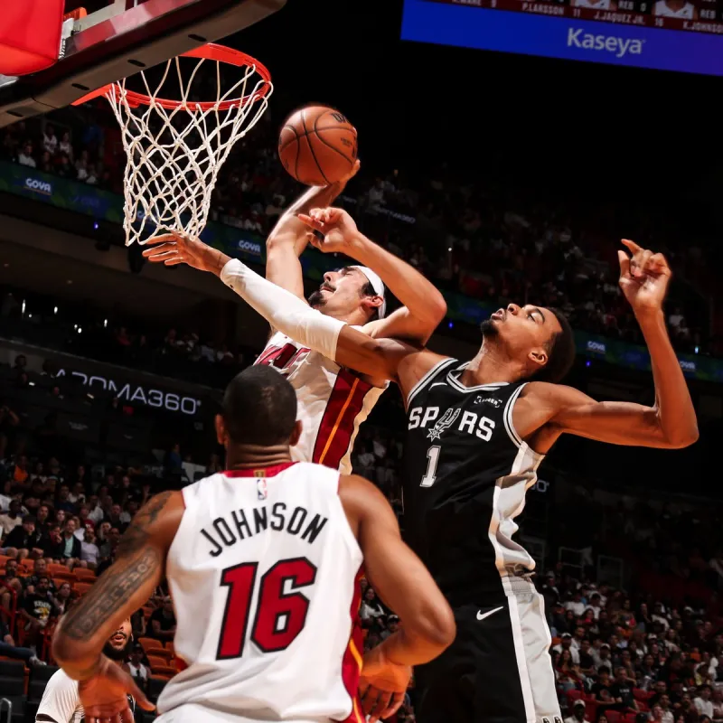 賽后,火官哈克熱火官方更新X,曬分享曬出一張熱火球員小海梅-哈克斯隔扣馬刺球員維克托-文班亞馬的扣文賽場(chǎng)照與球迷分享。