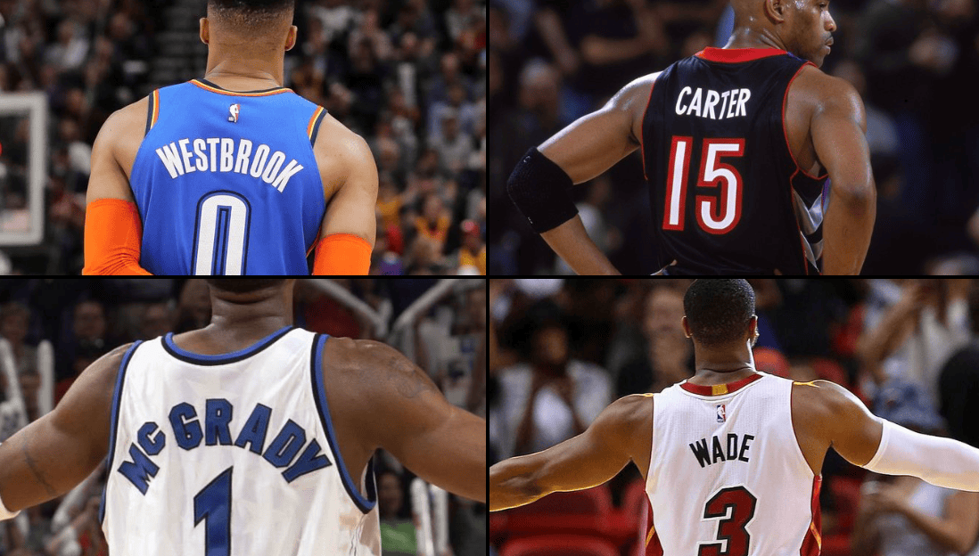 圖中四名球員是板媒比賽:拉塞爾-威斯布魯克,文斯-卡特,體發(fā)特麥特雷西-麥克格雷迪和德維恩-韋德。問(wèn)威