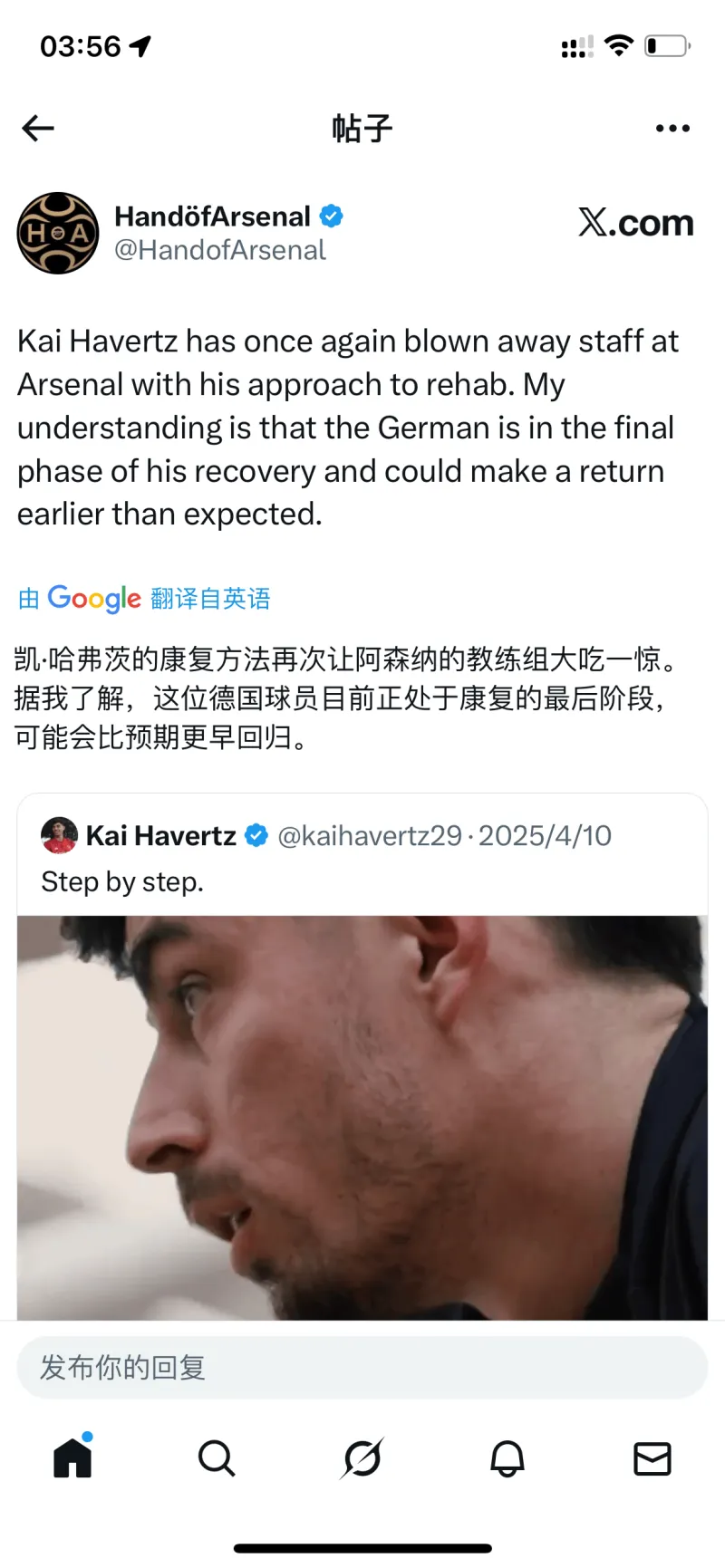 HOA:哈弗茨預計比預期時(shí)間提前回歸