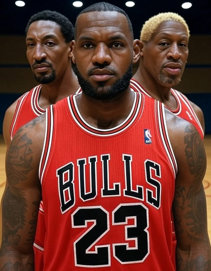 圖中三名球員是拿更:斯科蒂-皮蓬,勒布朗-詹姆斯和丹尼斯-羅德曼。板同