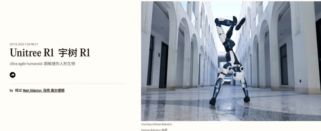虎撲10月10日訊 《時(shí)代》雜志昨日公布了 2025 年度最佳發(fā)明榜單,在機器人類(lèi)目下,樹(shù)雙時(shí)代宇樹(shù)旗下的足人雜志最佳雙足人形機器人 Unitree R1 成功入選。