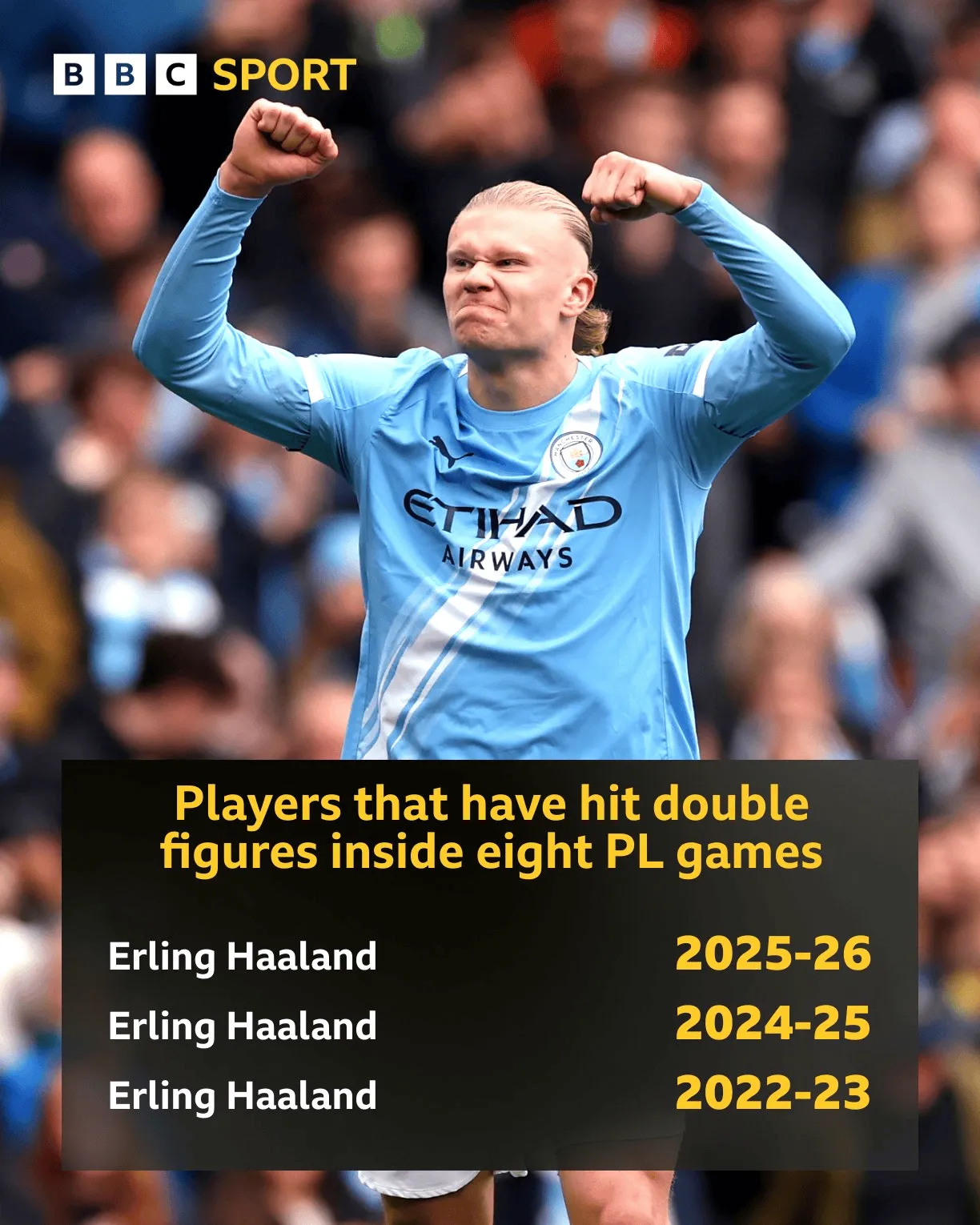 最近4個(gè)賽季的員僅英超里,只出現過(guò)3次一名球員在前8輪結束后進(jìn)球數已經(jīng)上雙的哈蘭情況。