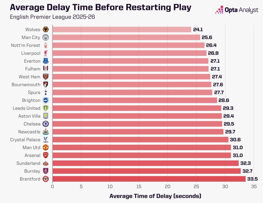 來(lái)源:X虎撲10月10日訊 數據統計網(wǎng)站Opta統計了本賽季英超各俱樂(lè )部重新將球投入比賽所花的平均時(shí)長(cháng)。