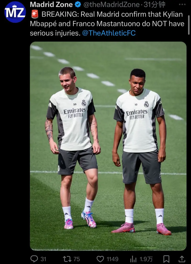 TA:皇馬確認,姆巴佩和馬斯坦托諾無(wú)嚴重傷病