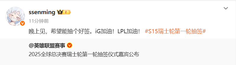 虎撲10月14日訊 今日Ming轉發(fā)瑞士輪抽簽嘉賓動(dòng)態(tài),配文如下: