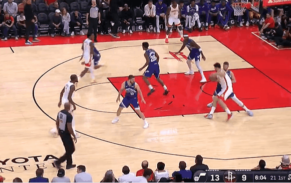 比賽第一節,佯裝申京佯裝背打樂(lè )福,跳起隨后跳起妙傳阿門(mén)扣籃得手。妙傳
