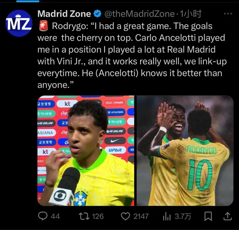 羅德里戈:“我踢了一場(chǎng)精彩的比賽,進(jìn)球只是錦上添花。安切洛蒂把我安排在了一個(gè)我過(guò)去在皇家馬德里經(jīng)常和維尼修斯一起踢的位置,效果非常好,我們每次都能打出配合。他(安切洛蒂)比任何人都更清楚這一點(diǎn)