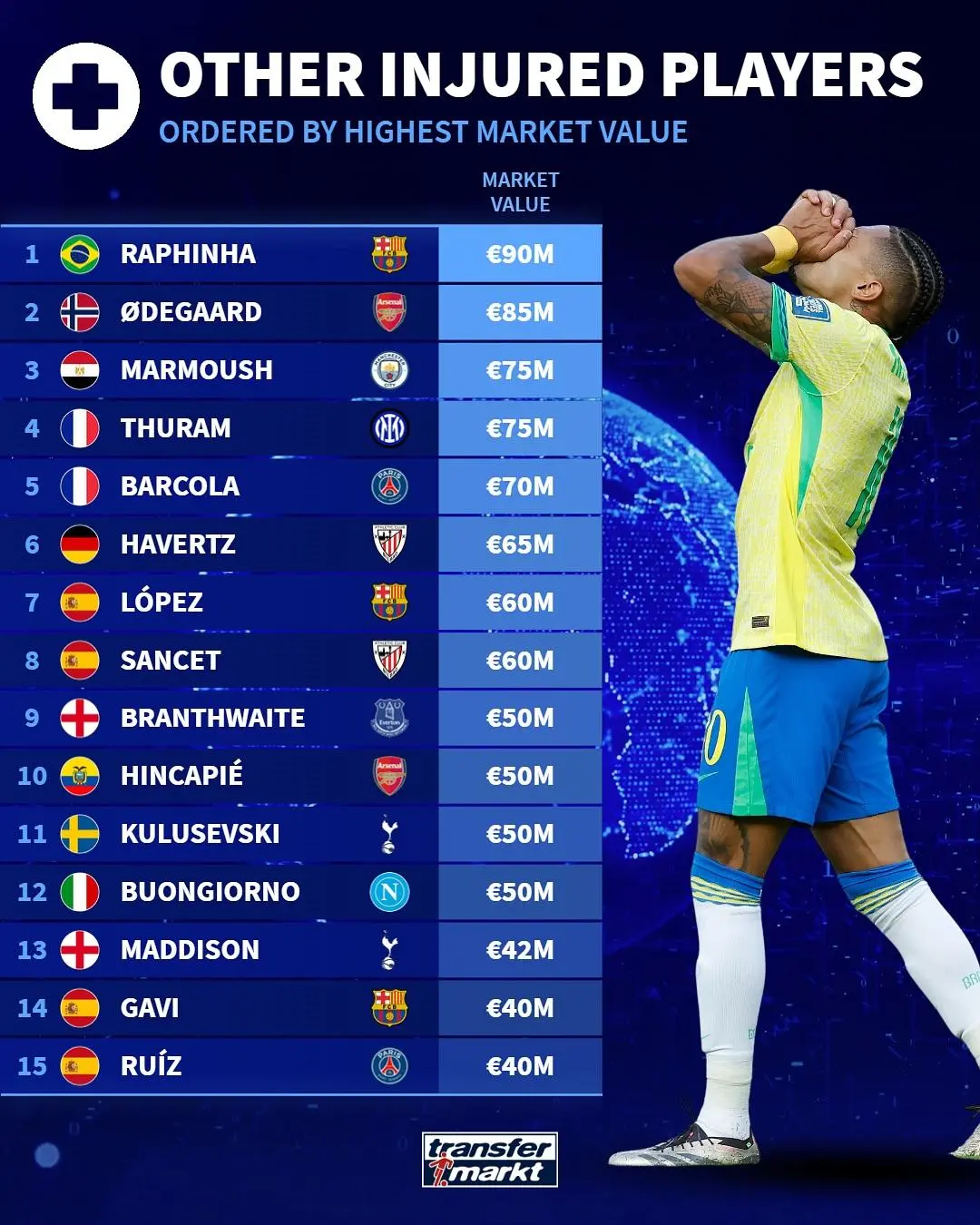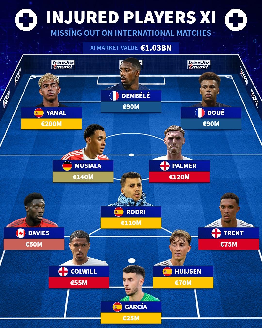 虎撲10月10日訊 德轉統計國際比賽日傷病最佳陣容:登貝萊、亞馬爾領(lǐng)銜,轉統最佳陣容羅德里、計國際比帕爾默在列。賽日傷病