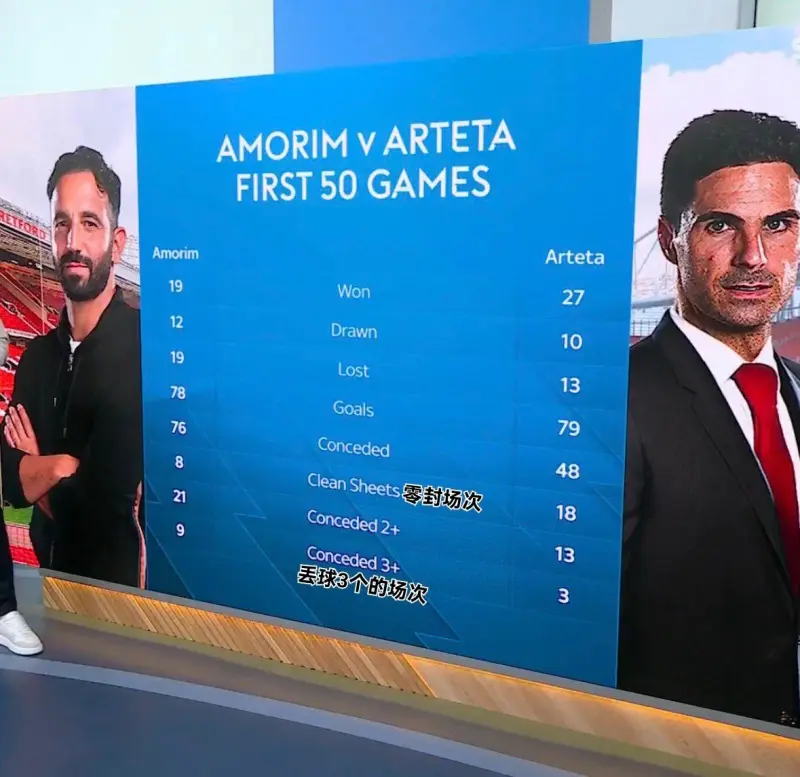 執教前 50 場(chǎng)比賽,阿莫林的曼聯(lián)進(jìn)球數只比阿爾特塔的阿森納少 1 個(gè)