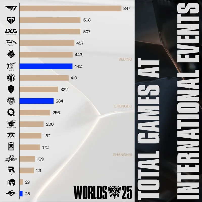 虎撲10月12日訊 LCP官推發(fā)布本次世界賽各戰隊選手參加國際賽事(先鋒賽/MSI/S賽)場(chǎng)次之和,T1居首,各戰GEN第二,隊選BLG位列第三。手參事場(chǎng)具體排名如下: