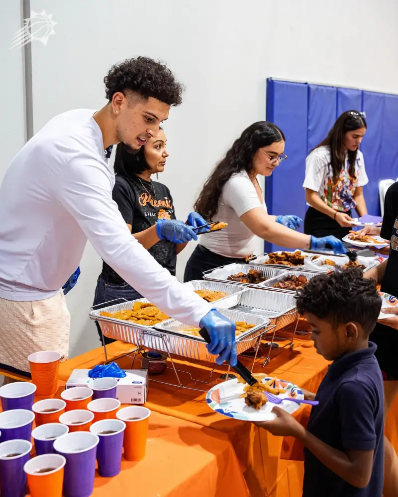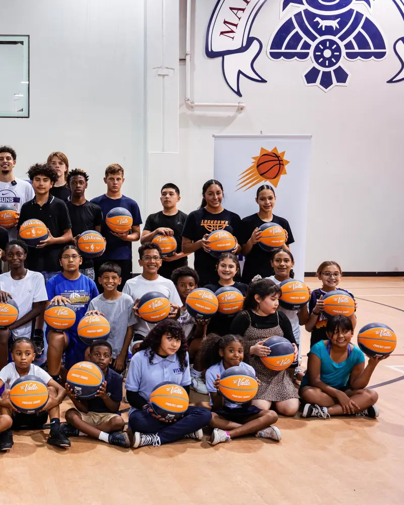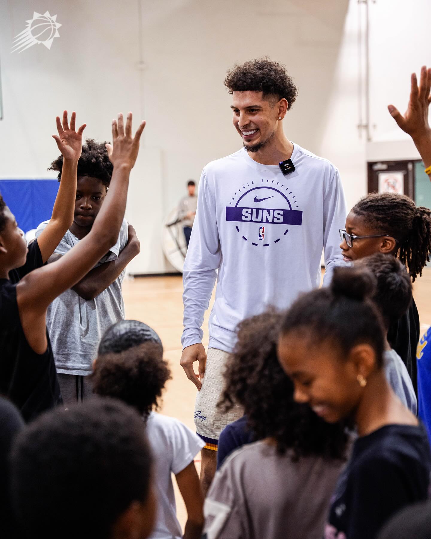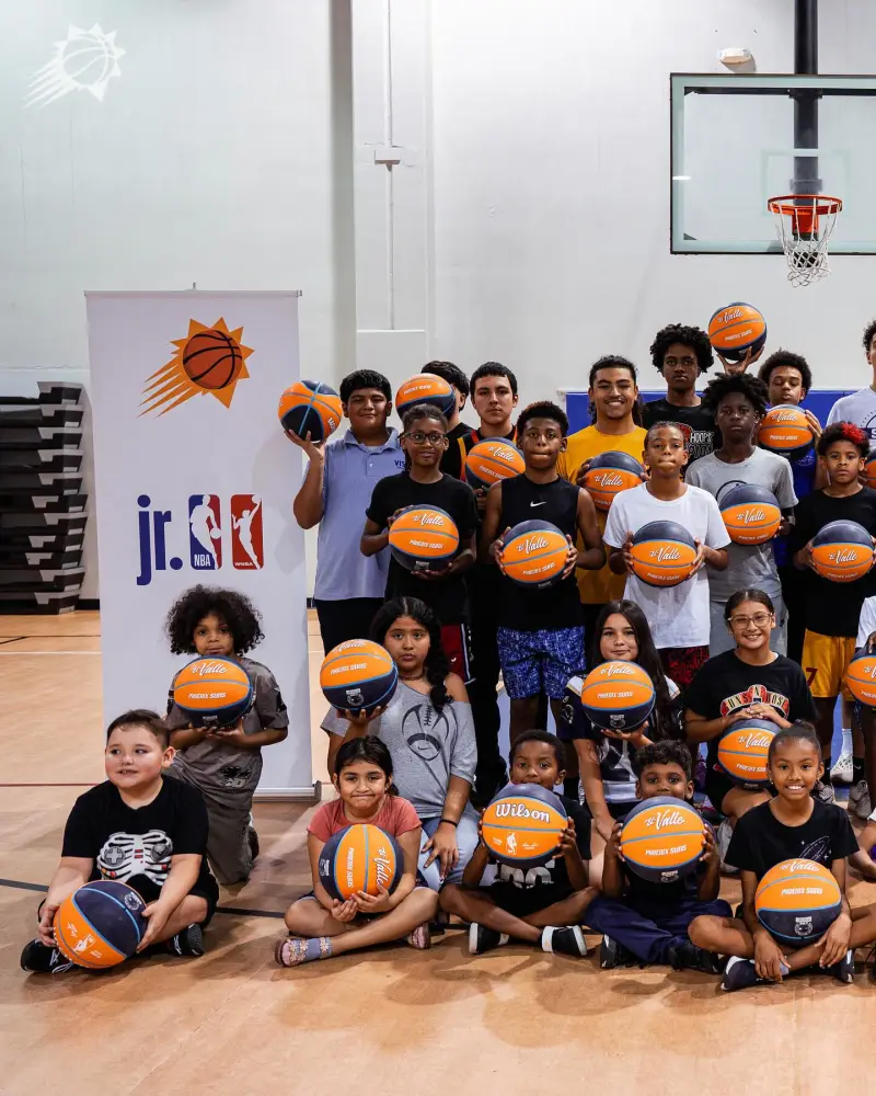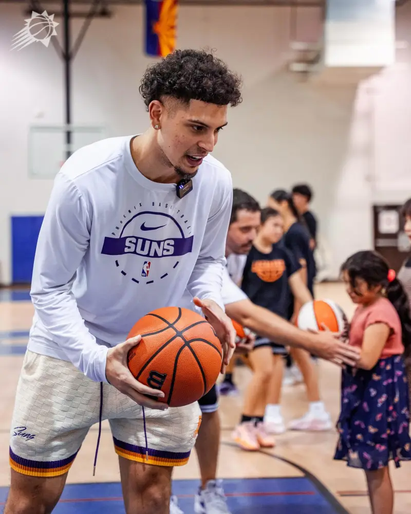 其配文:為慶祝西班牙裔傳統月,陽(yáng)官菲尼克斯太陽(yáng)隊與科比-布雷亞為韋斯利社區中心的板慶比孩子們舉辦了籃球訓練營(yíng)和社區聚餐活動(dòng)。