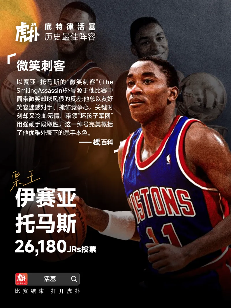 虎撲近期開(kāi)啟全新系列評選活動(dòng)——NBA隊史最佳陣容評選,我們邀請JRs于各隊隊史效力的托馬球員、教練中,斯票選出五位你心目中的當選隊史最強球員以及一位最佳教練,最終得票最多的活塞五名球員+一名教練組成隊史最佳陣容。