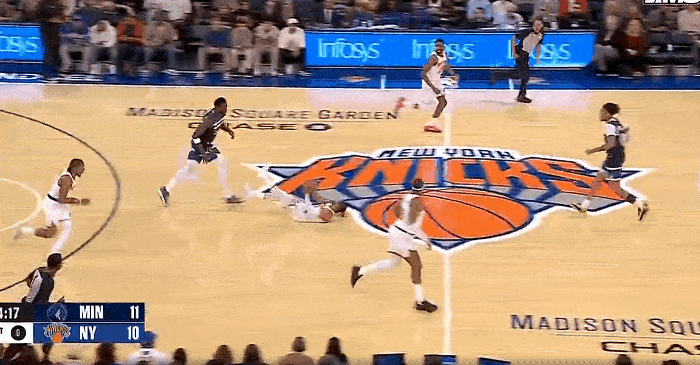 虎撲10月10日訊 NBA季前賽,尼克斯對陣森林狼的倒地比賽正在進(jìn)行中。